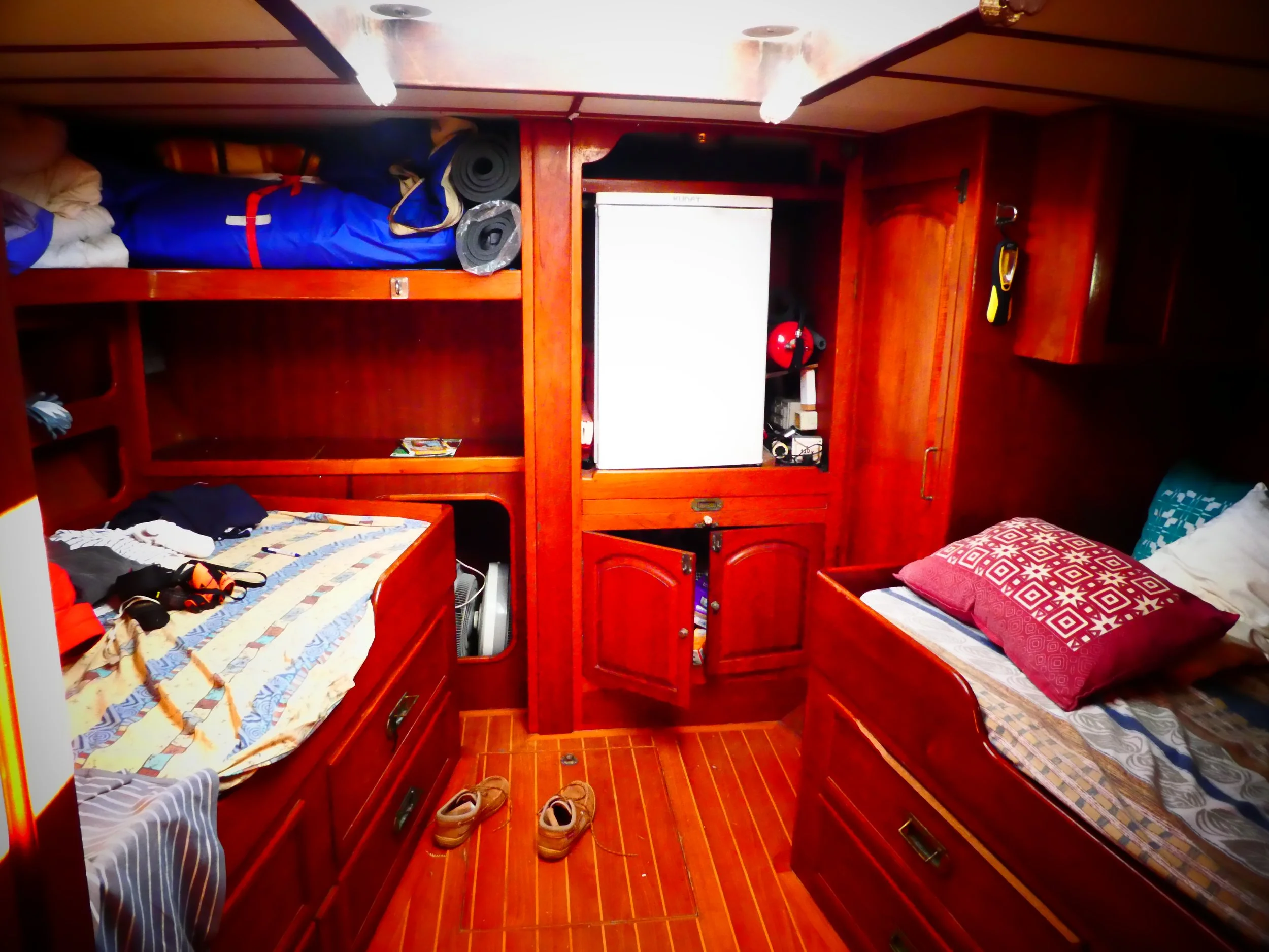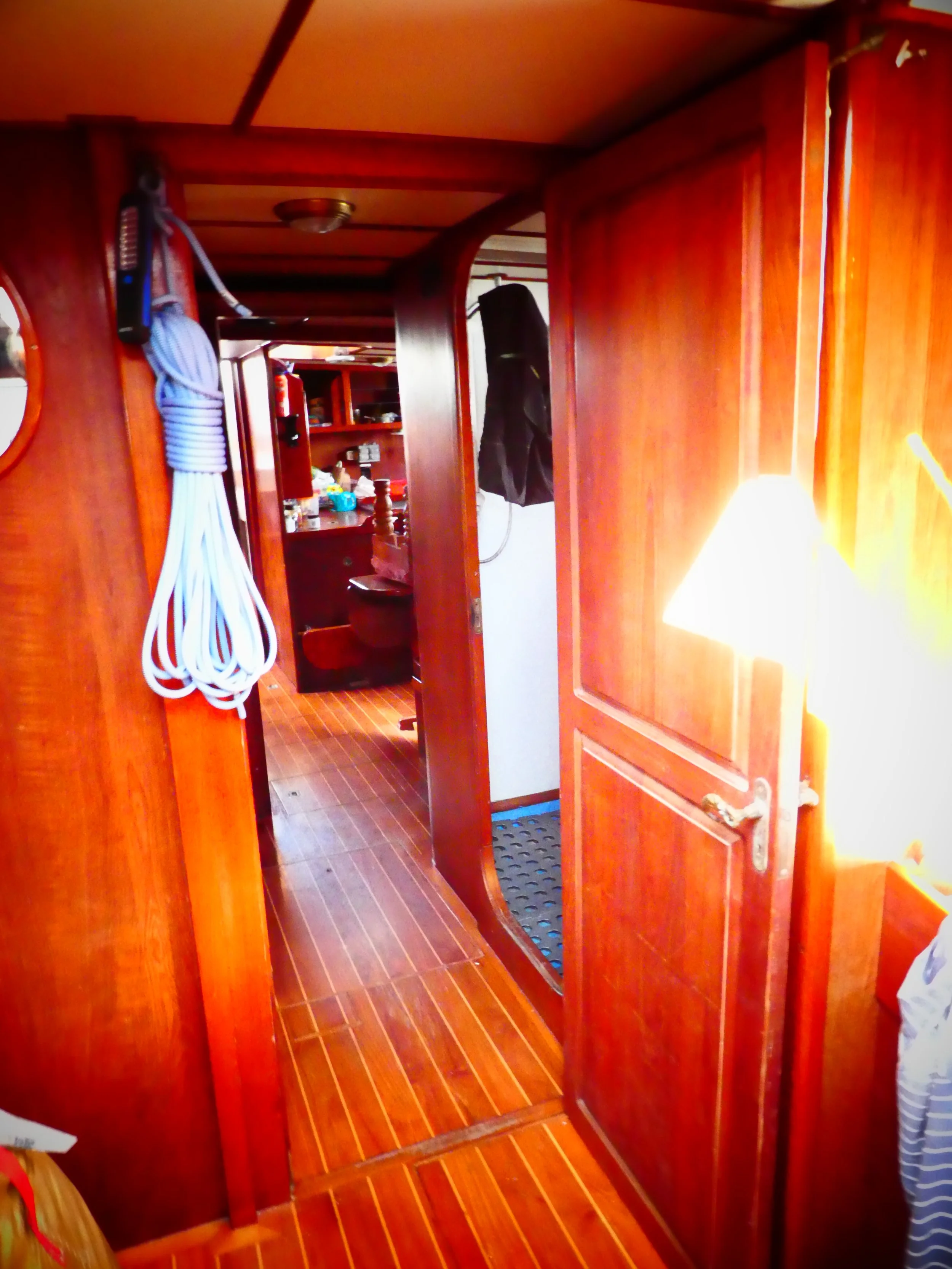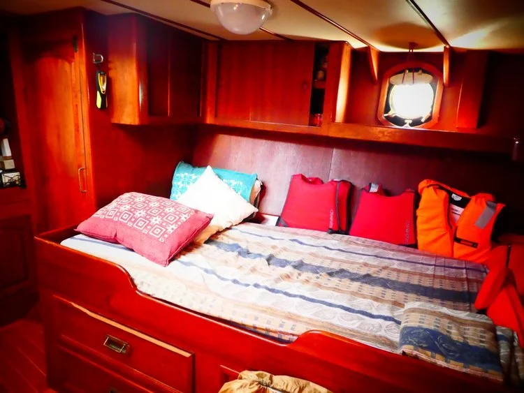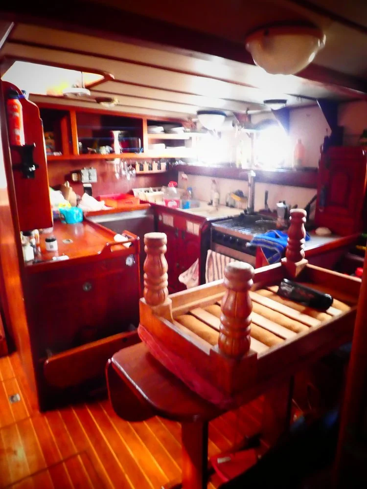 We refit her with the most important basic equipment done: new mast, rigging, sails, hybrid electro engine, windlass and the interior we keep humble with hammocs beds, good galley, safety , spacy and light.